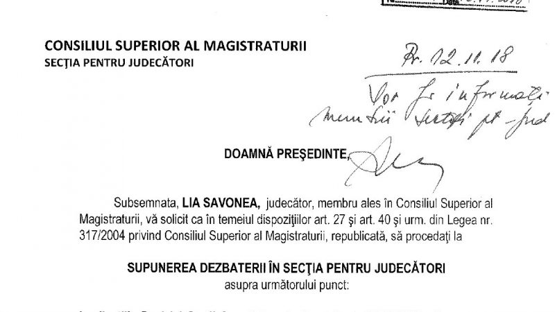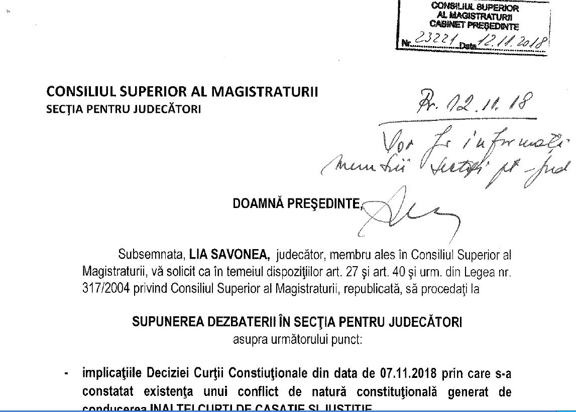 ”Generarea unui conflict de natură constituțională obligă Secția pentru Judecători să dezbată în ce măsură această conduită, în sine, nu semnifică abdicarea de la valorile justiției, de la obligațiile de a asigura părților dreptul de acces la o instanță imparțială și independentă, constituită conform legii, iar în caz afirmativ, să dispună măsura ce se impune în raport de gravitatea încălcărilor”, scrie judecătoarea Lia Savonea președintelui CSM.