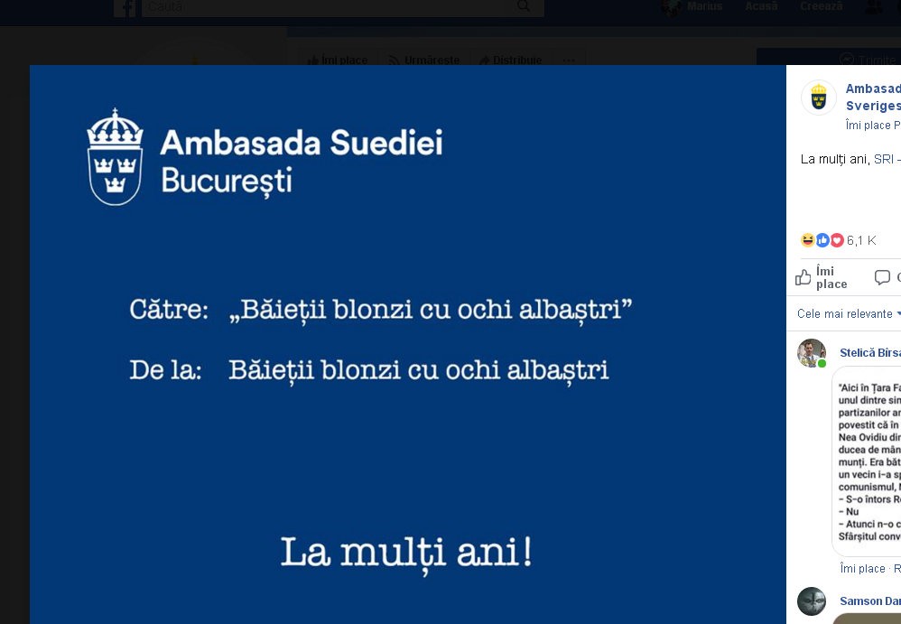 Zilele acestea se aniversează 29 de ani de activitate a S.R.I. Mulţi au felicitat acoperit momentul, dar alţii au preferat să salute descoperit serviciul. Funcţionarii Ambasadei Suediei au postat o felicitare către SRI: “De la băieţii blonzi cu ochi albaştri” către “Băieţii blonzi cu ochi albaştri.” Tenta de glumă prevesteşte o frăţie alta decât a inelelor din celebrul film.