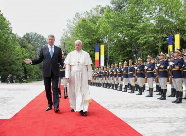 „Este o mare plăcere să vă avem pe pământ românesc”, i-a spus președintele Klaus Iohannis Papei Francisc, în timp ce...
