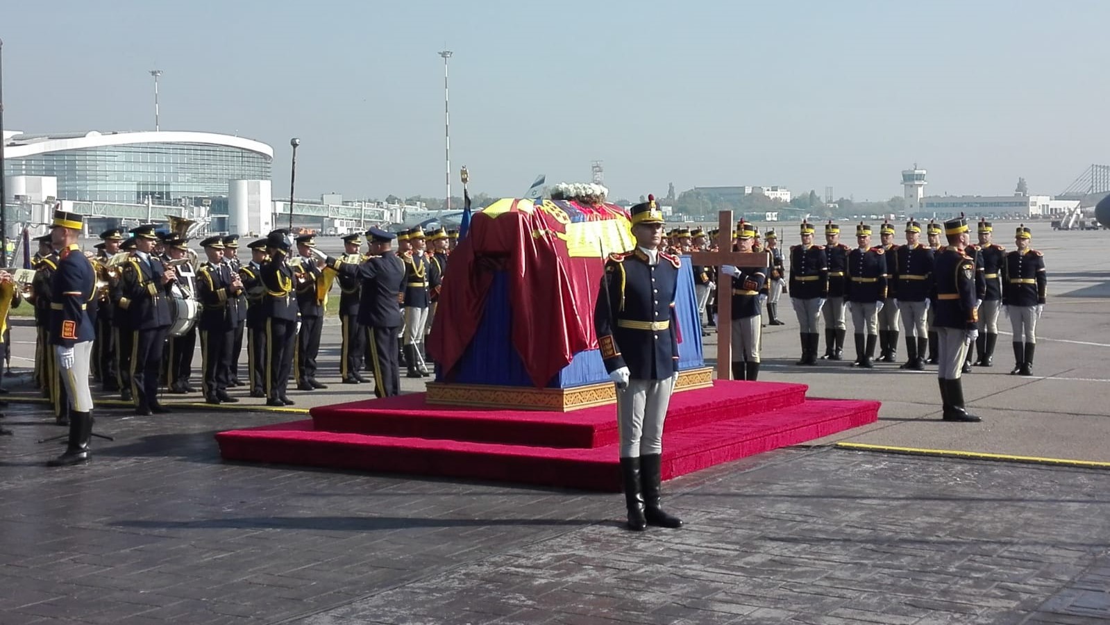 La aeroport a urmat un ceremonial militar și religios, la care au participat Majestatea Sa Margareta și membri ai Familiei Regale, reprezentanți ai instituțiilor Statului, ai Bisericii Ortodoxe Române, ai Armatei României, ai Corpului Diplomatic și ai altor confesiuni și religii din România.