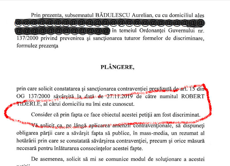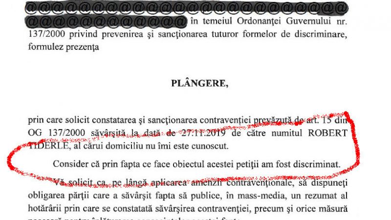 “Discriminarea constă în aceea că, prin manifestarea sa în spaţiul public, pârâtul relevă o atitudine cu vădit caracter discreiminatoriu, şi care instigă la un discurs al urii, al dezbinării”, scrie reclamantul în plângerea depusă la C.N.C.D.