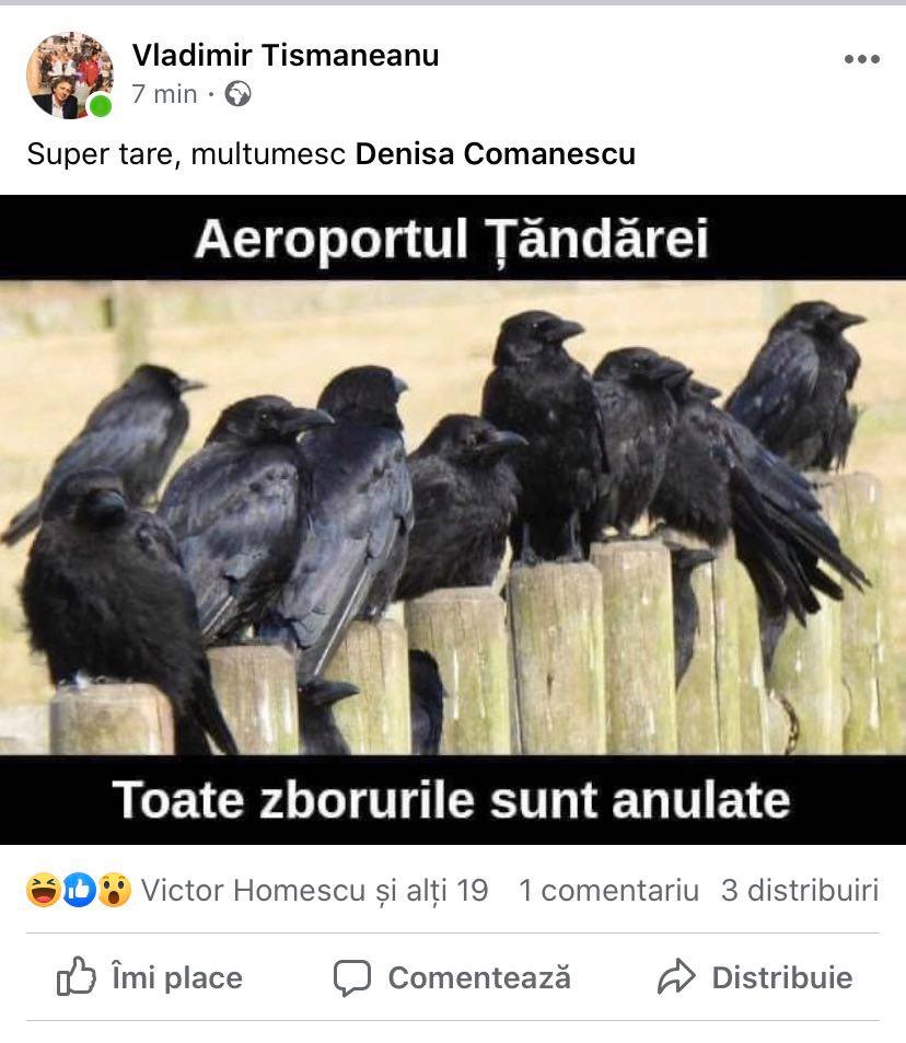 Politologul Vladimir Tismăneanu de la Universitatea Marryland, un globalist pur sânge, adept al Şcolii de la Frankfurt, a postat o fotografie cu “ciorile de la Ţăndărei”, pe care spune că a primit-o de la Denisa Comănescu, şef la editura Humanitas şi a catalogat-o „super tare”. Asaltat de critici, ulterior, a şters-o spunând că el trăieşte departe de ţară şi nu prea înţelege o serie de semnificaţii.