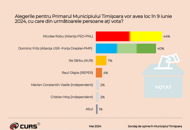 Conform sondajului CURS, Nicolae Robu, candidatul susținut de PSD și PNL, ar obține 44 %, în timp ce Dominic Fritz, candidatul susținut de USR-Forța Dreptei și PMP ar obține 40%.