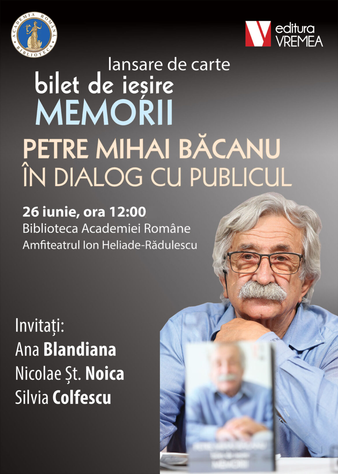 Miercuri, 26 iunie, ora 12:00, în cadrul Bibliotecii Academiei Române, Editura Vremea vă invită la un dialog inedit cu jurnalistul Petre Mihai Băcanu, pe marginea cărții sale de memorii Bilet de ieșire. Vor lua cuvântul Ana Blandiana și prof. ing. Nicolae Șt. Noica, autorul preferând să se angajeze într-un dialog cu publicul, în locul unei cuvântări. Evenimentul va fi încadrat de o expoziție de documente de arhivă, fotografii și instantanee din ziarul România Liberă.