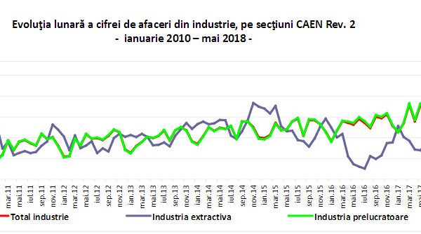 Cifra de afaceri din industrie, în luna mai 2018, faţă de luna mai 2017, a crescut pe ansamblu cu 11,4%,...